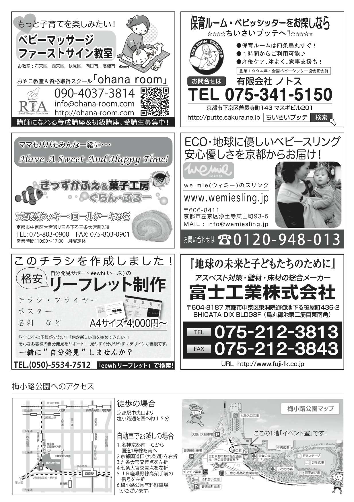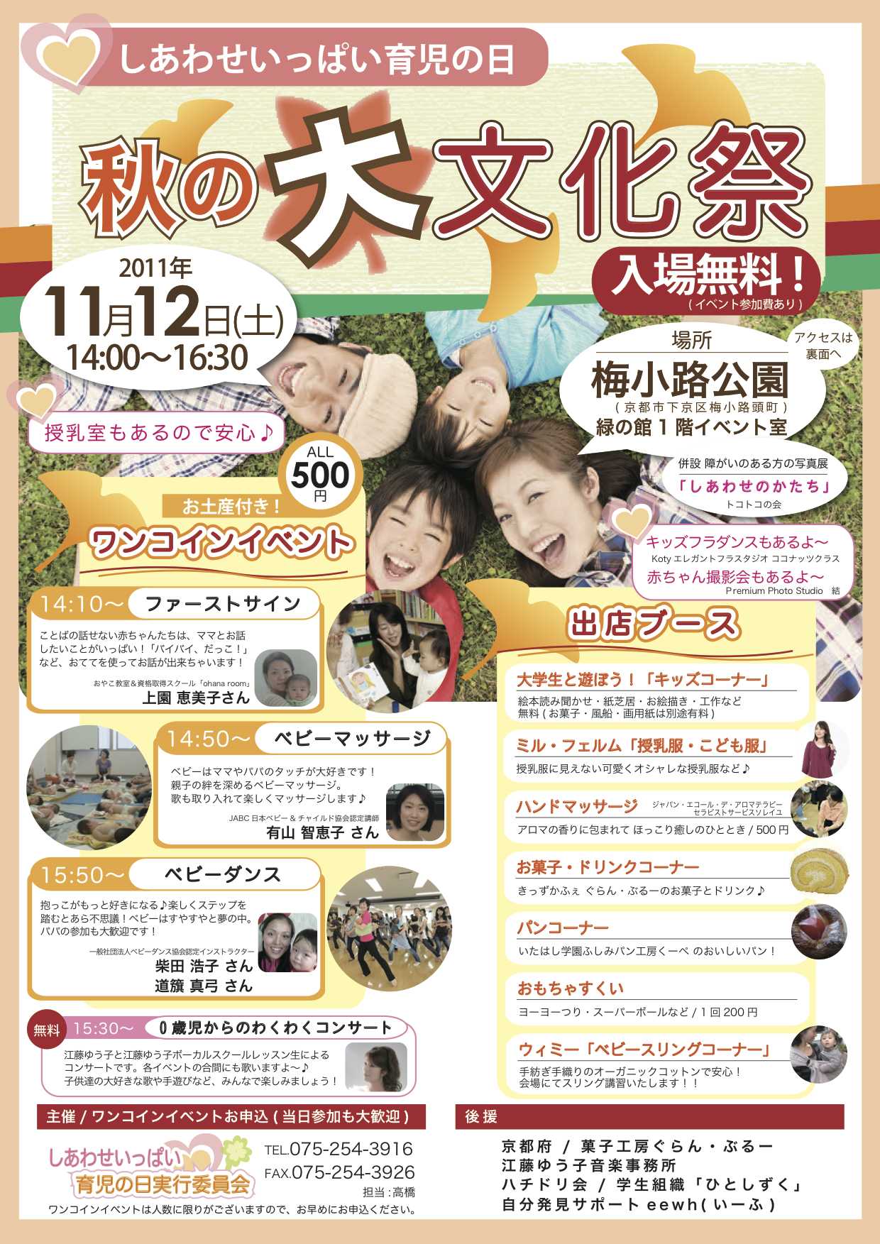 育児ママ・パパが楽しめる イベント・ブースが満載! 授乳室もあるので安心♪ 日時 : 2011年 11月12日(土) 14:00〜16:30 場所 : 梅小路公園 緑の館 1 階イベント室 京都市下京区梅小路頭町 料金 : 入場無料 !(イベント参加費あり)