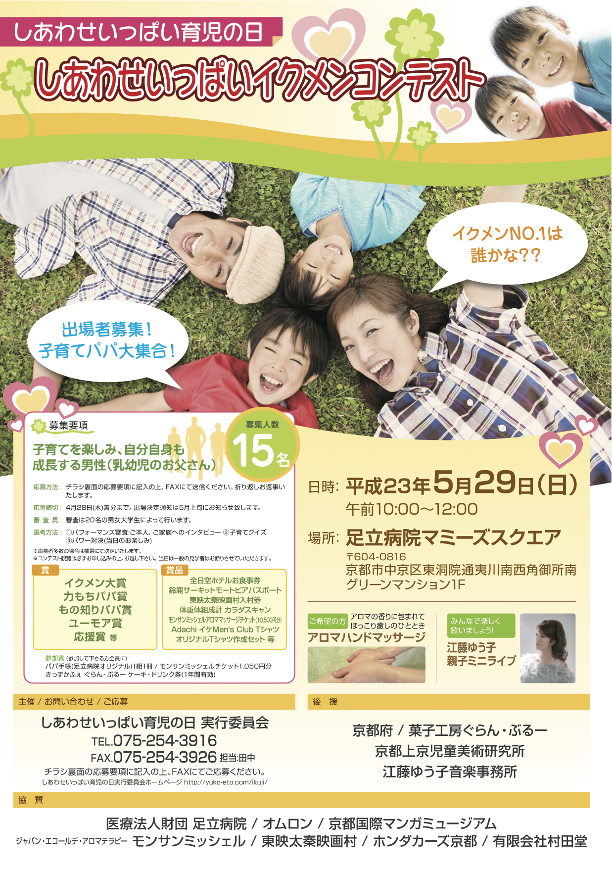 日時 : 2011年 5月29日(日) 午前10:00〜12:00 場所 : 足立病院マミーズスクエア 〒604-0816 京都市中京区東洞院通夷川南西角御所南グリーンマンション1F コンテストの詳細、結果発表などはこちら |